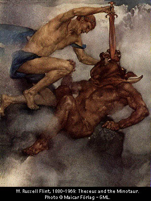En la mitologia griega, monstruo de cabeza de toro y cuerpo de hombre,nacido de la union del toro enviado por Poseidon, con Pasifae.Encerrado por Minos en el laberinto, cada año le eran ofrecidos siete muchachos y siete doncellas, hasta su muerte a manos de Teseo.